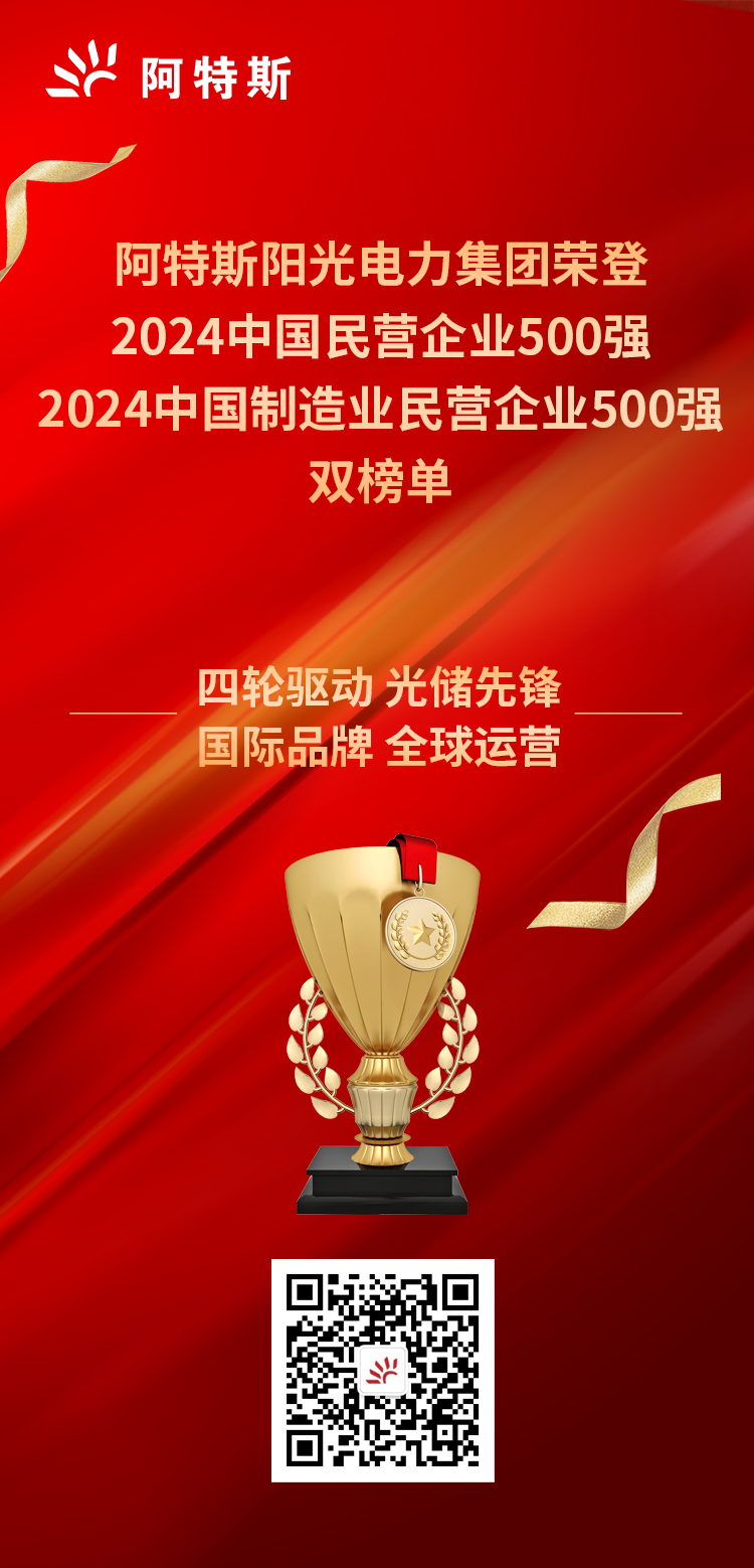 2024年10月12日,中华天下工买卖连结会(简称“天下工商联”)发布“2024中国民营企业500强”榜单,阿特斯阳光电力集团凭借2023年513亿元的营收,荣登“2024中国民营企业500强”、“2024中国制造业民营企业500强”双榜单。