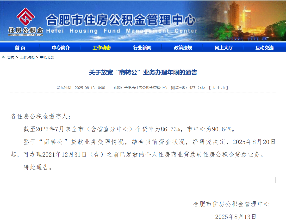 8月13日,合肥市住房公积金惩处中心发布对于放宽“商转公”业务办理年限的晓谕,划定2025年7月末全市(含省直分中心)个贷率为86.73%,市中心为90.64%。鉴于“商转公”贷款业务受理情况,集会现时资金气象,做生意量决定,2025年8月20日起,可办理2021年12月31日(含)之前已披发的个东说念主住房交易贷款转住房公积金贷款业务。